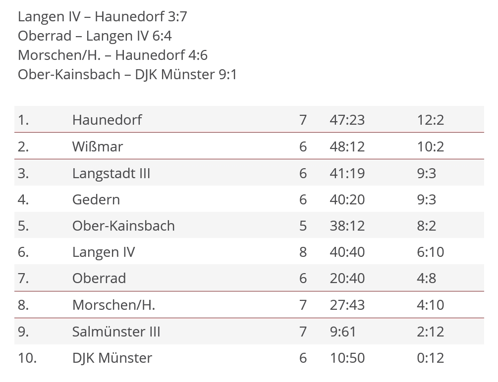 3. Kreisklasse, Gruppe 3: TSV Beuern II - TV Großen-Buseck III 4:6, SV Münster - SV Ettingshausen III 5:5, TSG Alten-Buseck IV - SV Münster II 8:2, TSV Villingen - FSV Lumda IV 8:2